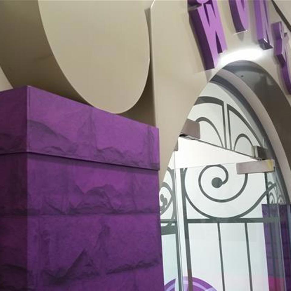 The concept included purple brick pillars, frosted “gated” glass doors, and of course, an image of Mr. Wonka himself watching over the room.