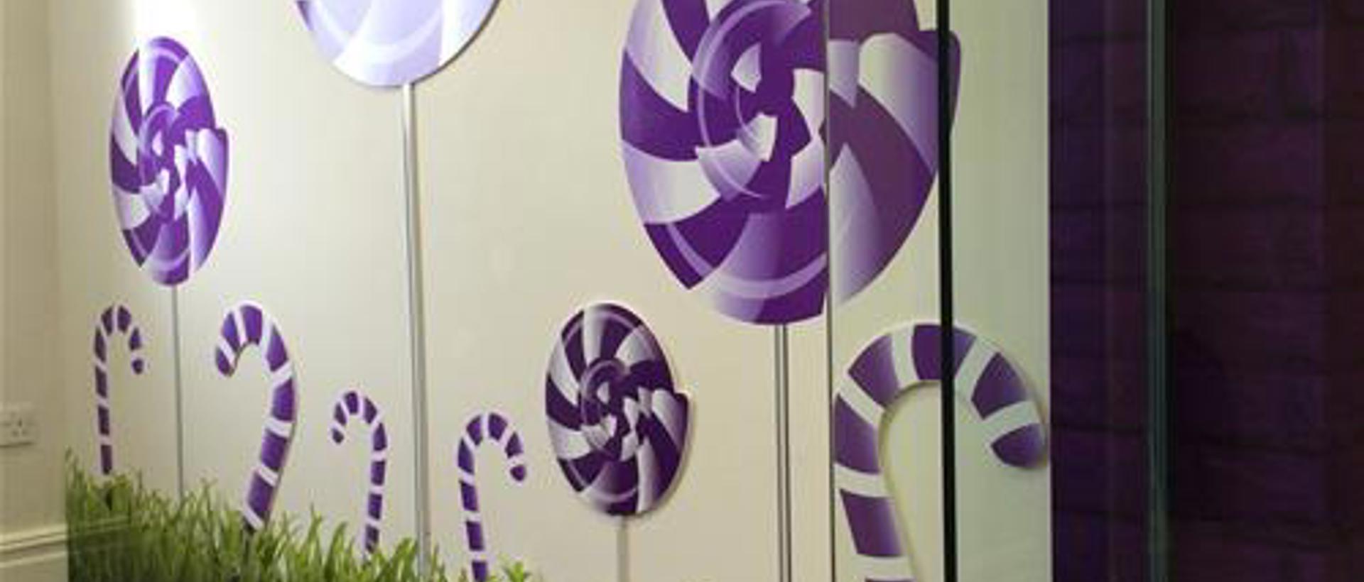To give the room its playful edge, we used a mix of printed vinyl, layered textures, and 3D acrylic elements — those finishing touches that make everything feel alive. The oversized lollipops and realistic grass detailing were made from acrylic and precision cut to give real depth and vibrancy.
