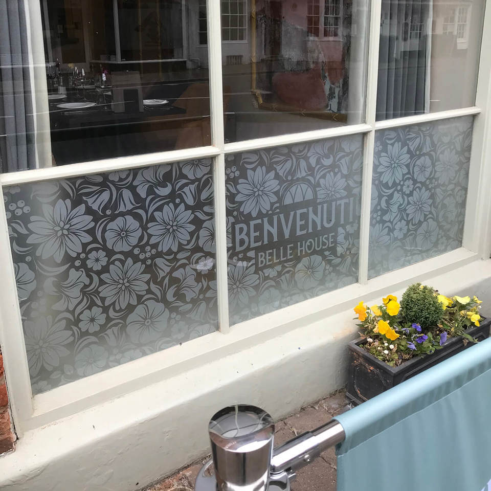 We further increased the visibility with two projecting signs that enable the restaurant to be seen from all angles, and the silver stretched window manifestations with floral detailing add areas of interest and elegantly frame the Benvenuti logo.