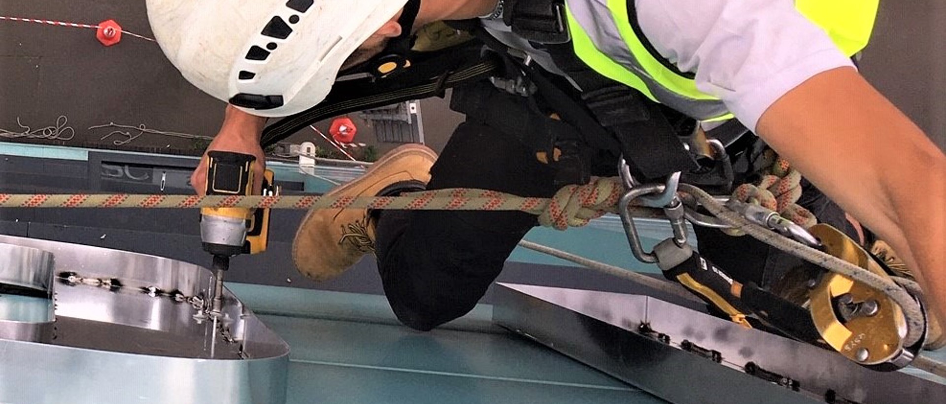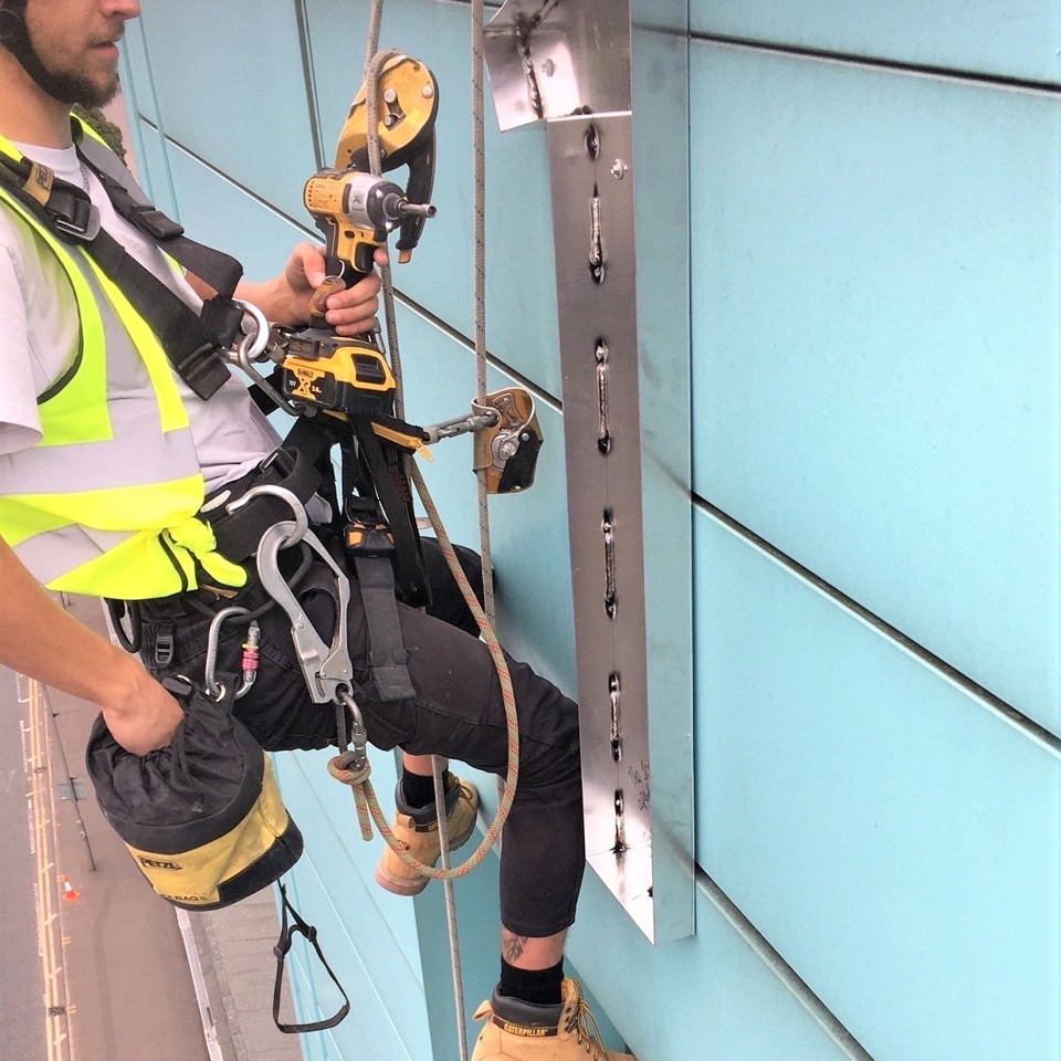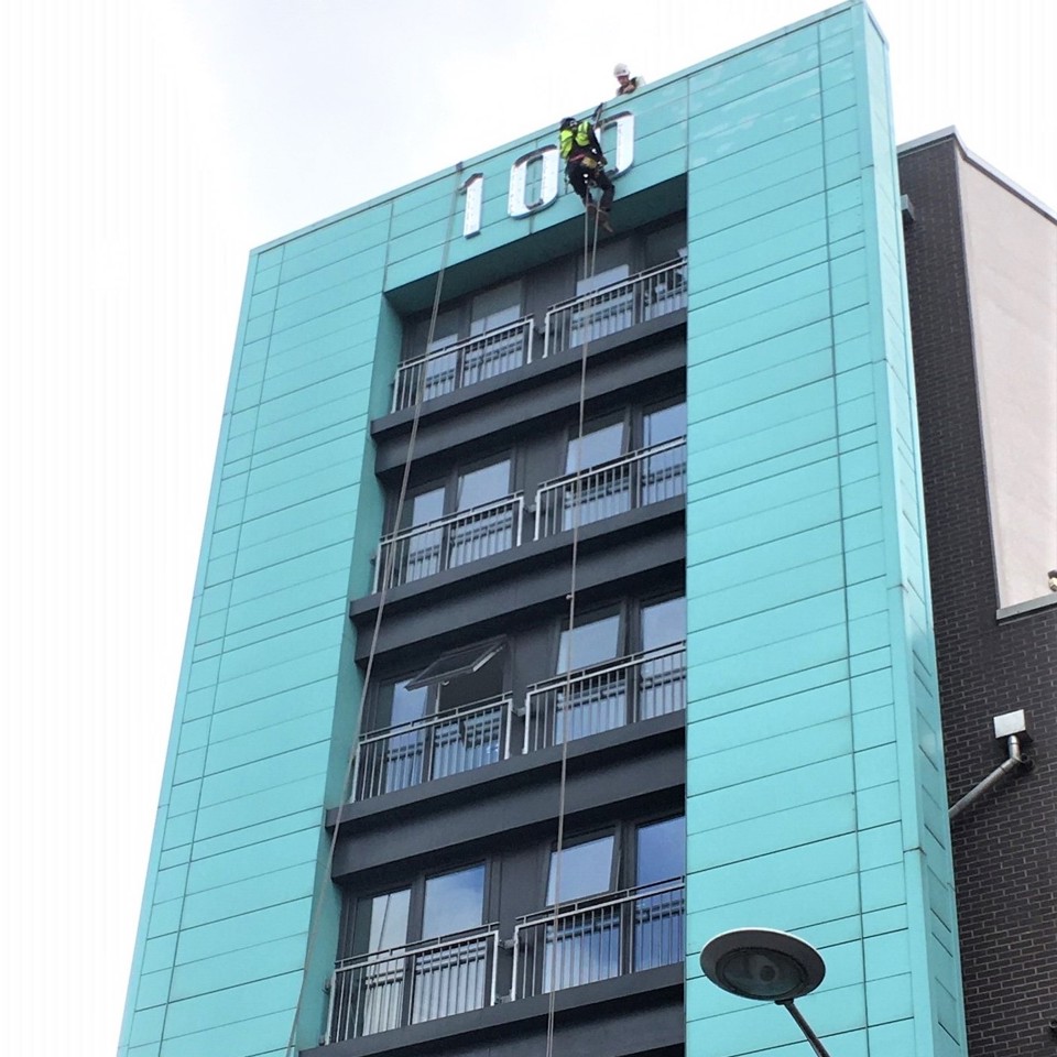 Due to the height of the building and location of the sign, the only option was to abseil down the side of the tower from the roof to avoid road closures, which would have had a significant impact on travel in the surrounding area.