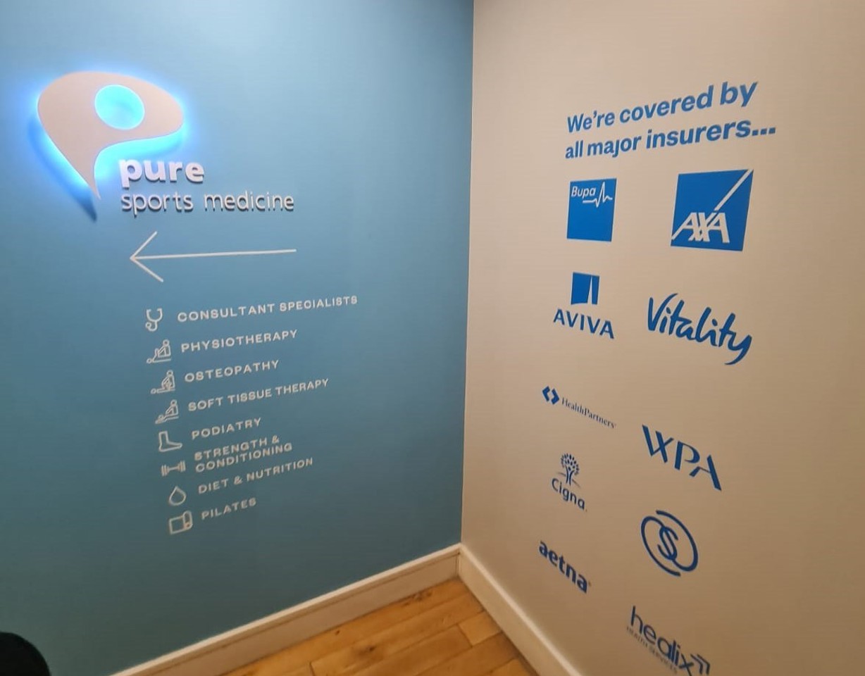 Signage that is permanently installed like a logo panel fixed to the reception wall, acrylic meeting room identifiers, or branded privacy film on internal glazing typically qualifies.*
