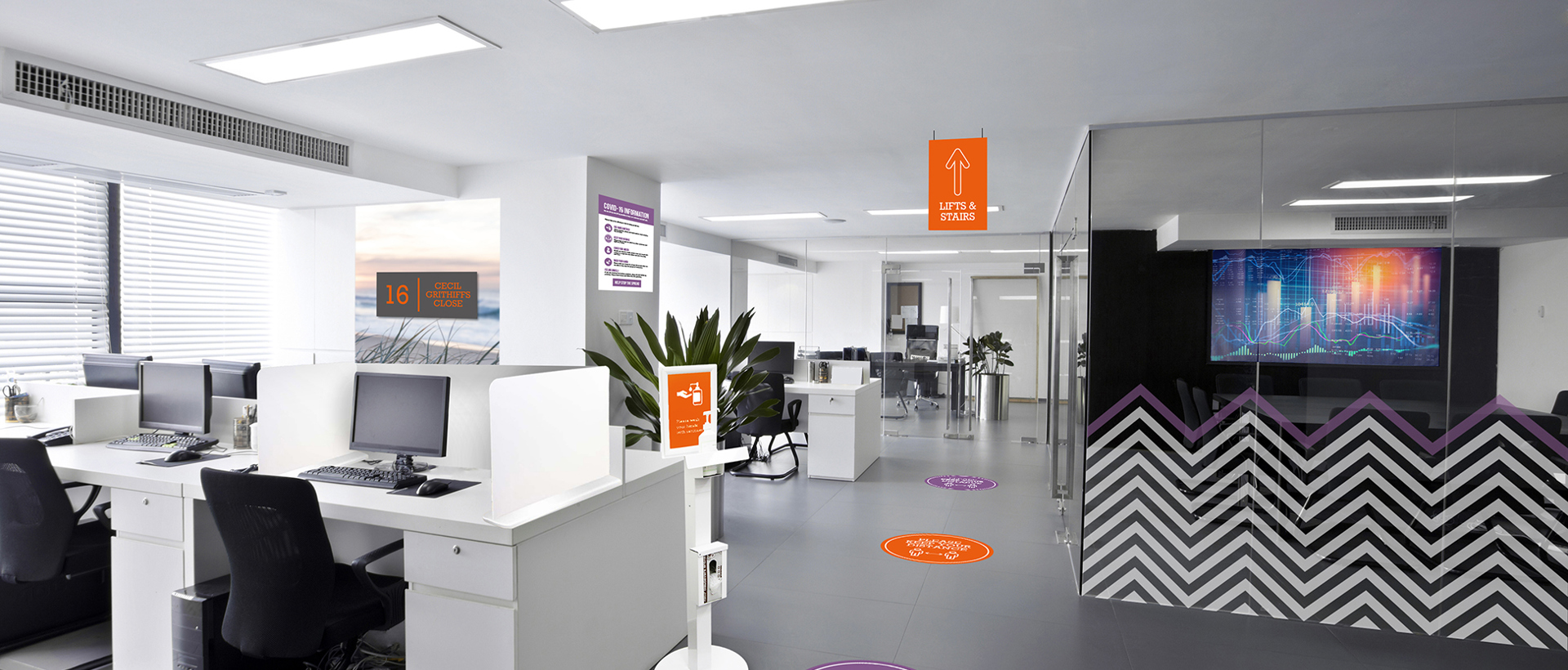 - Wayfinding signs – making sure people can navigate around your office is essential to help them feel confident and comfortable, sign posting meeting rooms, offices and facilities for an accessible space.