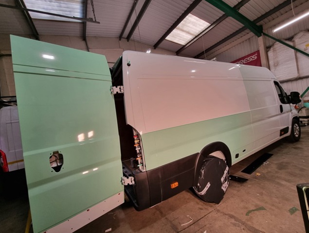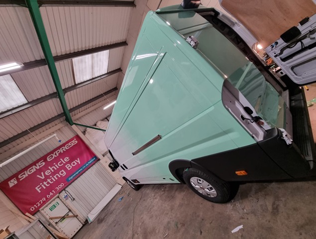 Starting as a plain white van, we used specialist clear wrap media to print in green brand colours of client to fade from green to clear. This means the front of the van does not require wrapping to achieve this effect. Printing on clear media is the only way to achieve the seamless look from white front of vehicle to the vibrant printed green. The design also ensures join lines are masked in bodywork swages, door shuts and weld lines for this to be achieved.