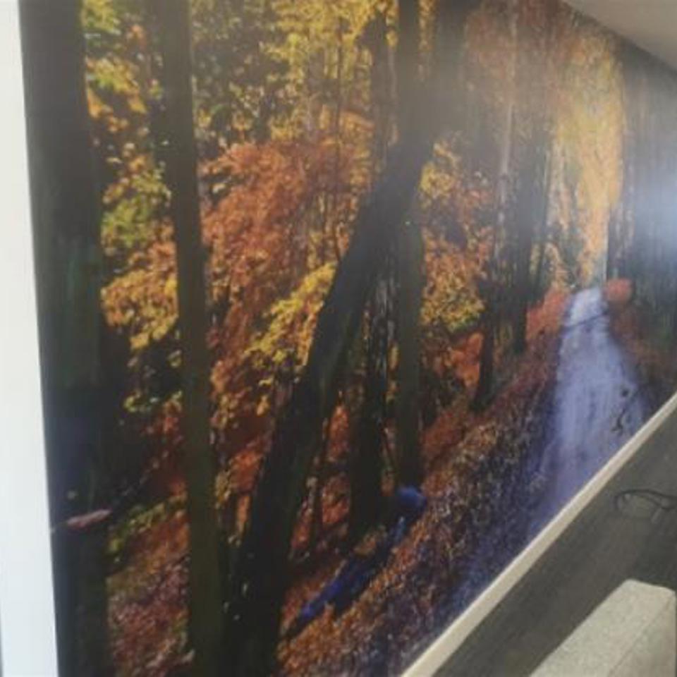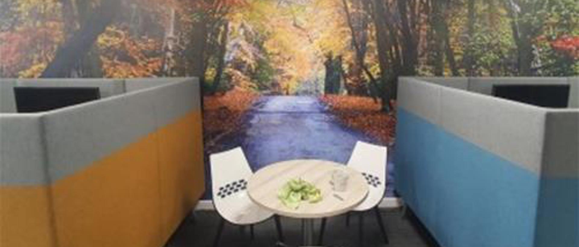 An autumn scene from Epping Forest was placed behind a cluster of meeting hub furniture — creating the impression that the seating area led straight into the forest.