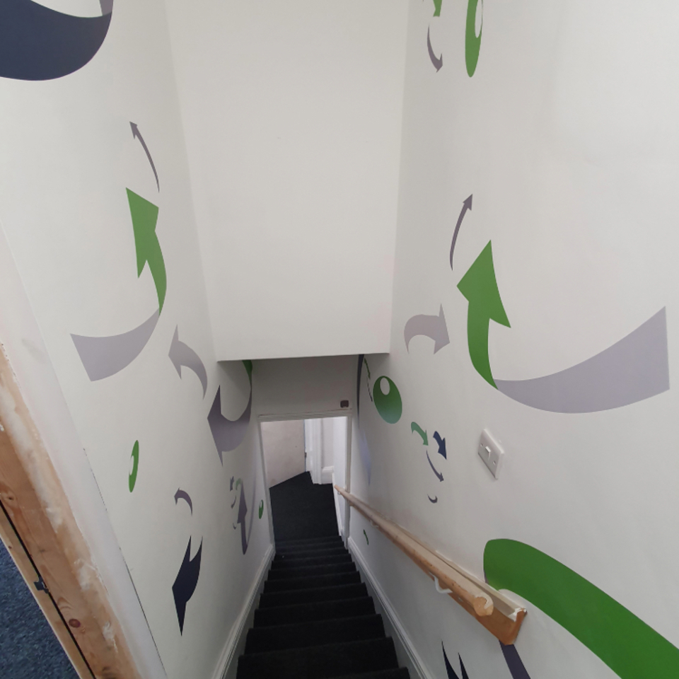 Moving inside, we deconstructed the company logo, using elements to craft a compelling wall vinyl to leave a lasting impression about the business on their customers. We chose to use an ultra-grab printed, matte laminated vinyl to provide a professional looking finish and minimize the glare from artificial lighting.
