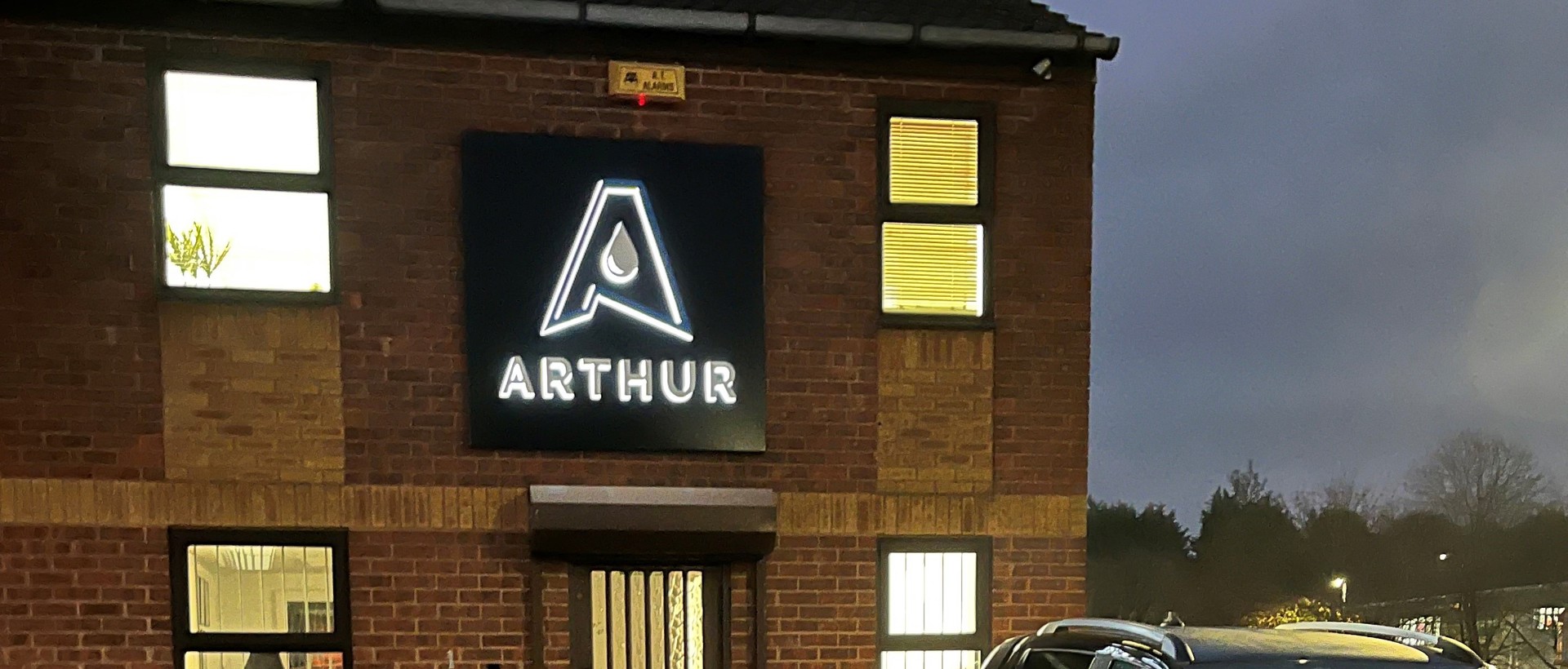 More recently, the Arthur team asked us for suggestions regarding their exterior illuminated signage. It was agreed that a black, square aluminium tray would suit the location best and would keep within their brand guidelines. The ‘A’ logo was to be the focus of the sign, and this was to be finished with their blue contrast. Having seen sight of our sample sign board, the use of back-lit halo illumination was agreed upon.