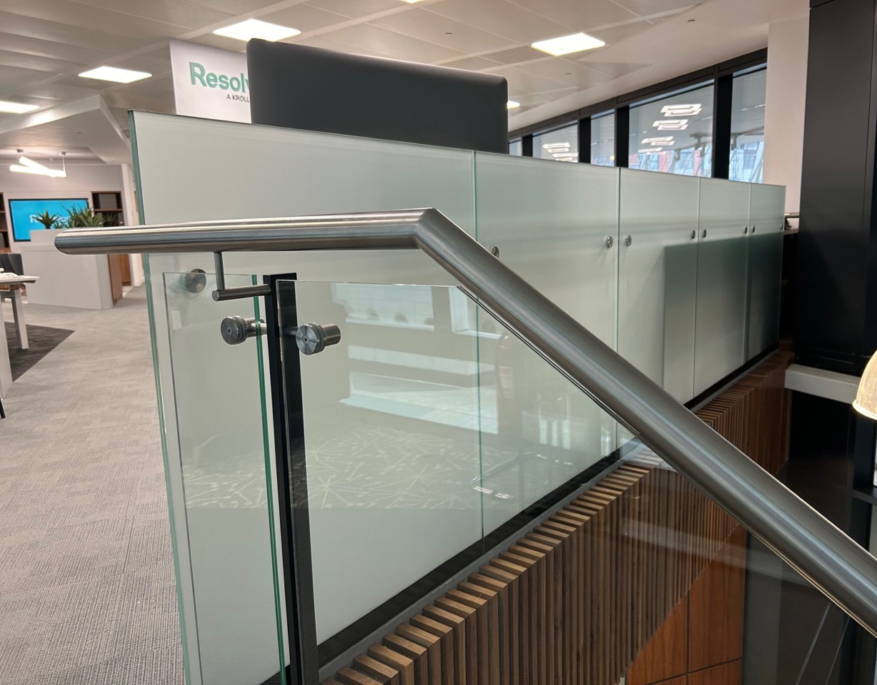 To ensure brand consistency, we extended the frosted vinyl treatment to balustrades, delivering a sleek, cohesive look throughout the office.