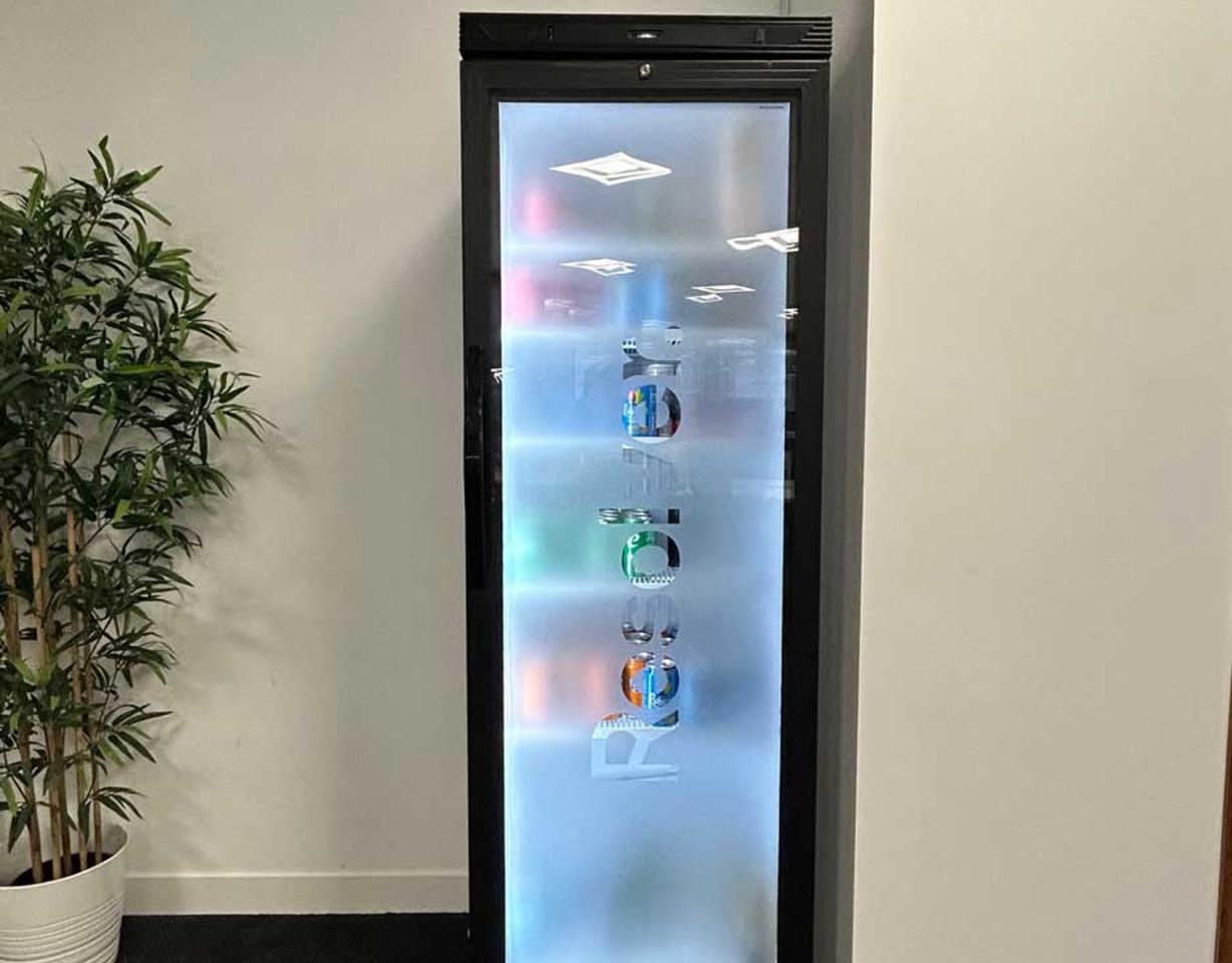 In a final touch of brand integration, we applied frosted vinyl to the glass fridge doors with branded vinyl, featuring cut-out logos for a professional look.