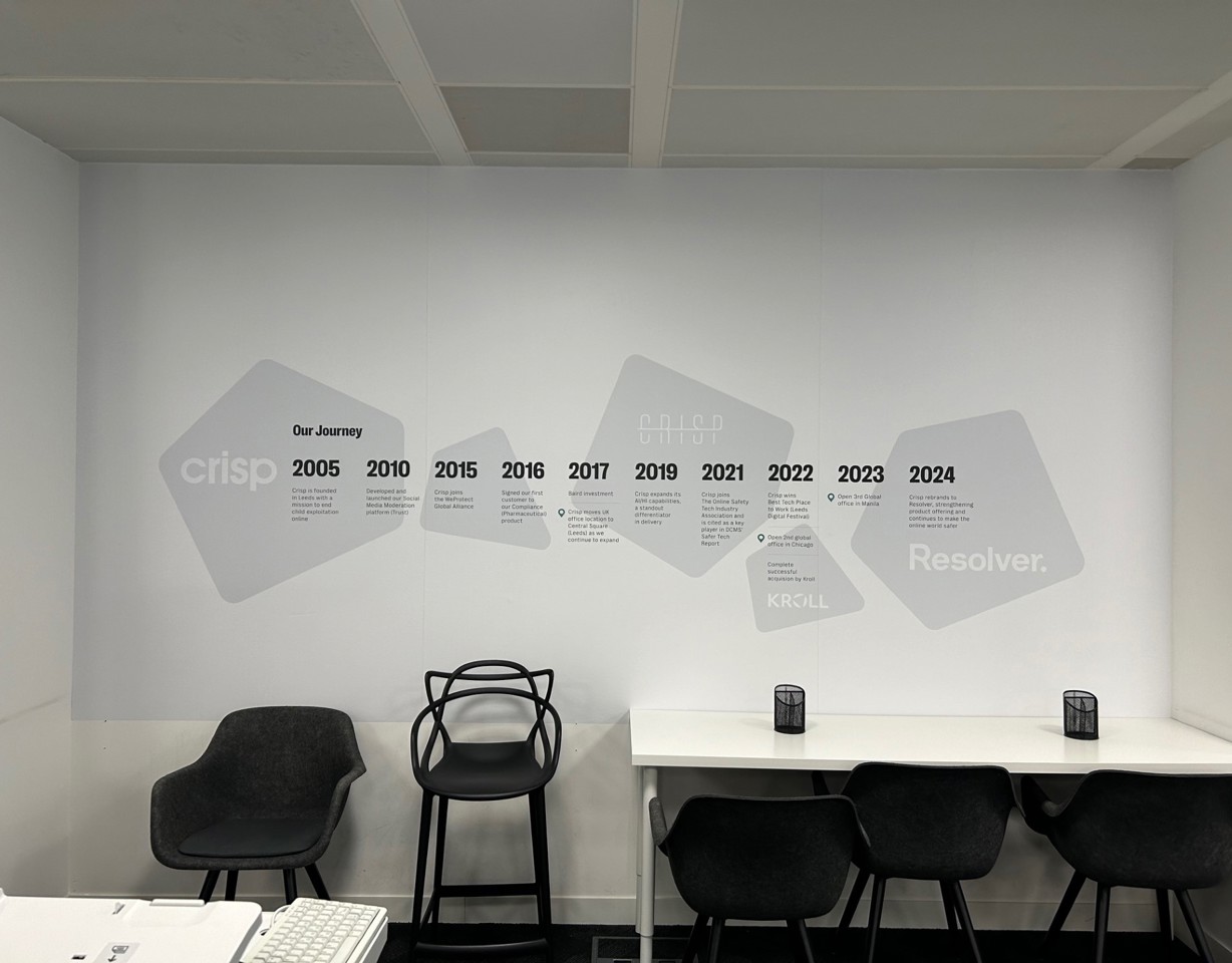 A feature timeline graphic was designed and installed, showcasing Resolver’s history, culture, and brand evolution. This served as an informative and engaging visual centrepiece, reinforcing the company’s journey and values.