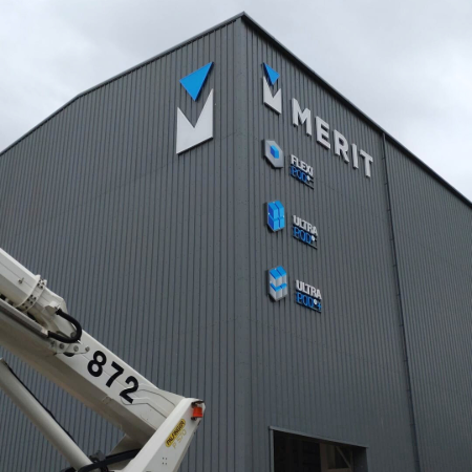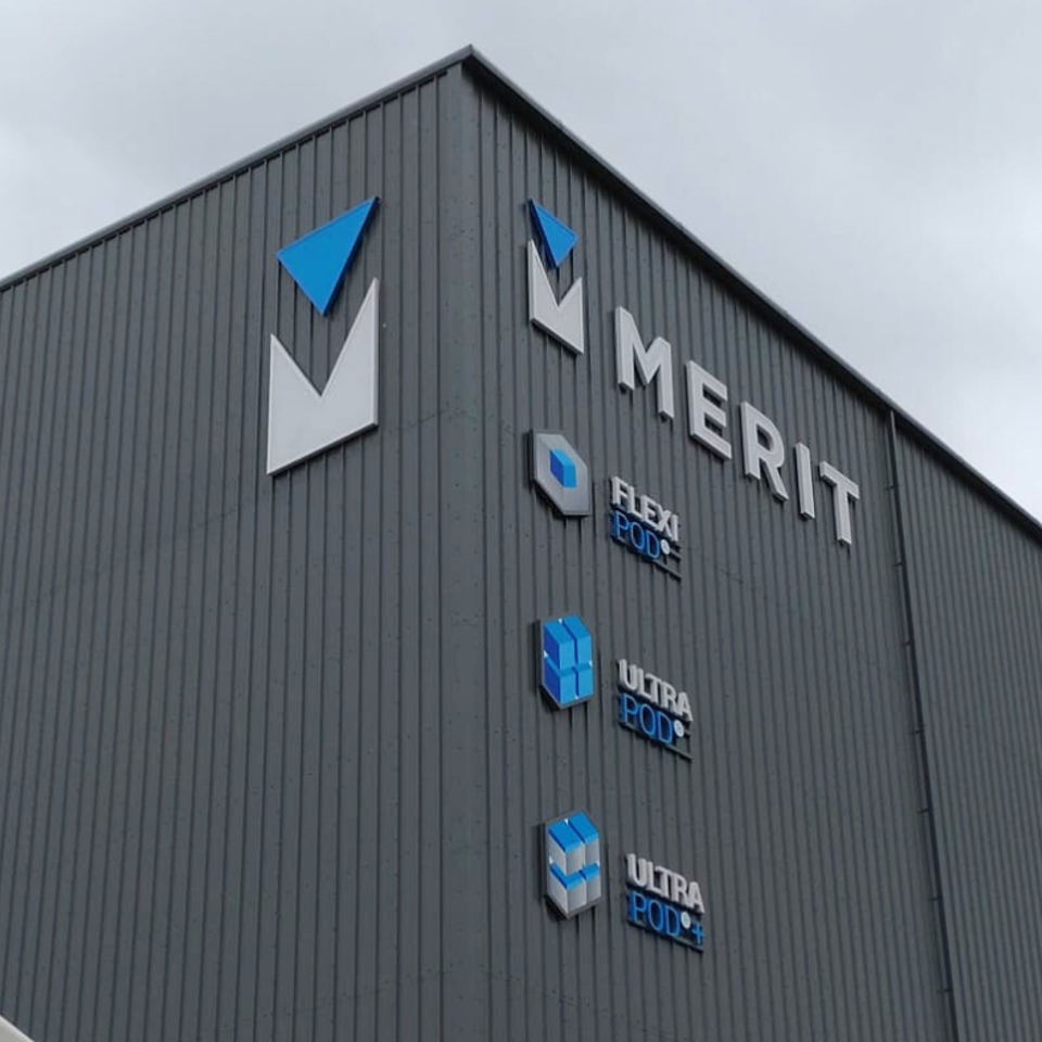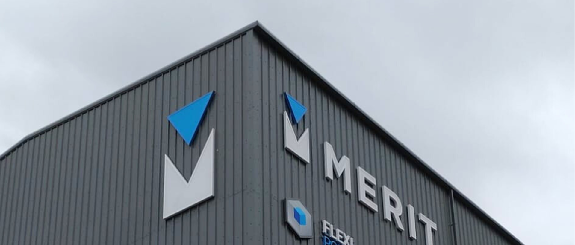 To call attention to their Cramlington-based factory, Merit needed a large exterior sign featuring their logo within a specific budget. The factory is one of Europe’s largest offsite manufacturing facilities at 314,000sqft that serves as a home for their ‘Design and Manufacture’ approach –so the customer wanted to highlight its presence on the industrial estate where it’s located.