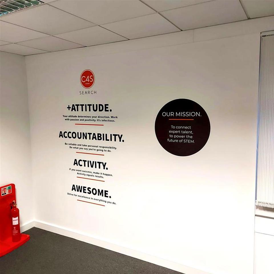 We visited the site first to get a proper feel for the building and the layout. From there, we pulled together a plan that included wall graphics, glass manifestations, and some exterior branding. Inside, we produced a series of motivational quotes using Metamark cut vinyl. These were placed across the office walls to give each area a bit of character and energy.