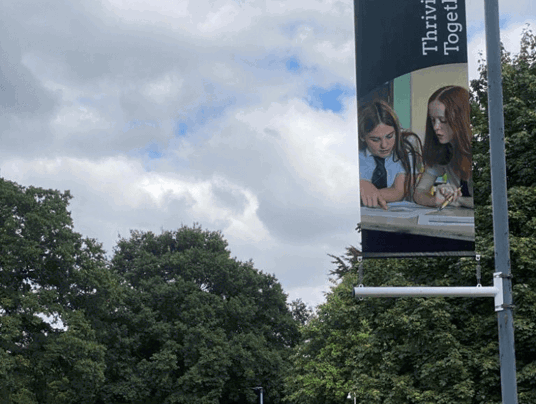 We carried out a detailed survey of the site and, working with the designer, created a plan to implement the new brand throughout the school using signage. This involved replacing existing signage and adding new ones, including a brand new monolith and flags fitted to poles all the way up the school drive.