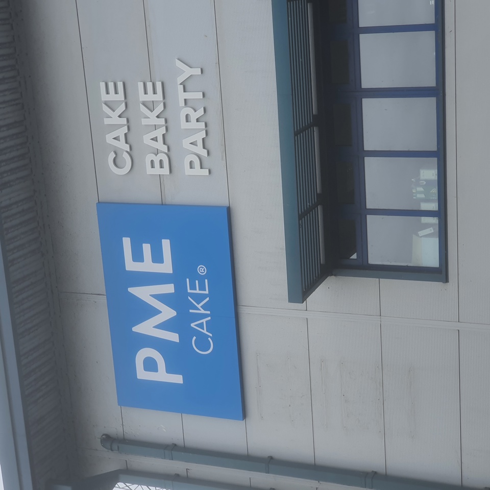 The warehouse sits in a busy industrial park, lots of big grey units around, so the new sign needed to stand out but still fit the look of the place. We went with a powder-coated tray sign, fitted just under the roofline, and added built-up letters that read Cake. Bake. Party. Simple, neat and very PME.