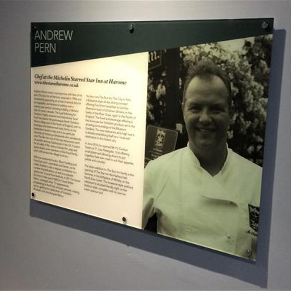 - Reverse-printed acrylic panels showcasing biographies of former students who have gone on to become celebrity chefs.