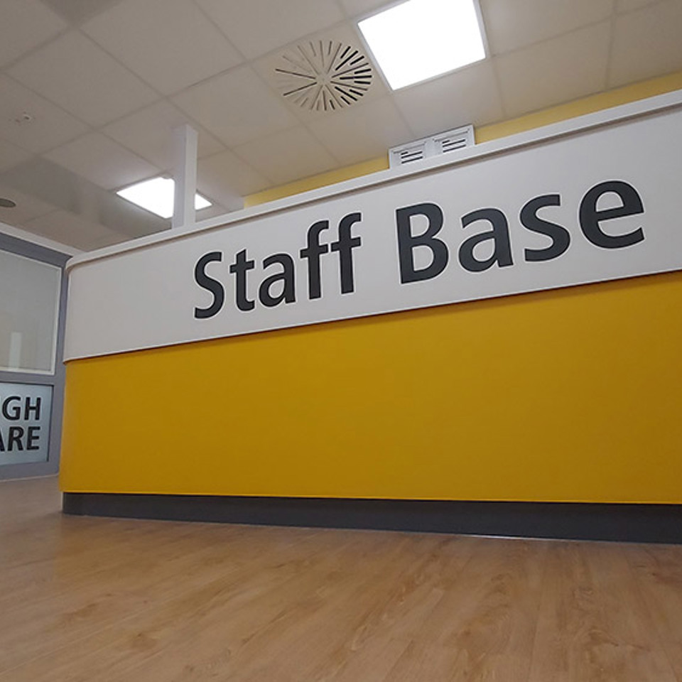 Also provided was a large sign for the ‘Staff Base’, wall mounted Foamex panels and interchangeable panels to accommodate any changes to the location of specific treatment areas and a large aluminium panel on the exterior of the building, announcing the location of the new Emergency Department and Medical Same Day Emergency Care.