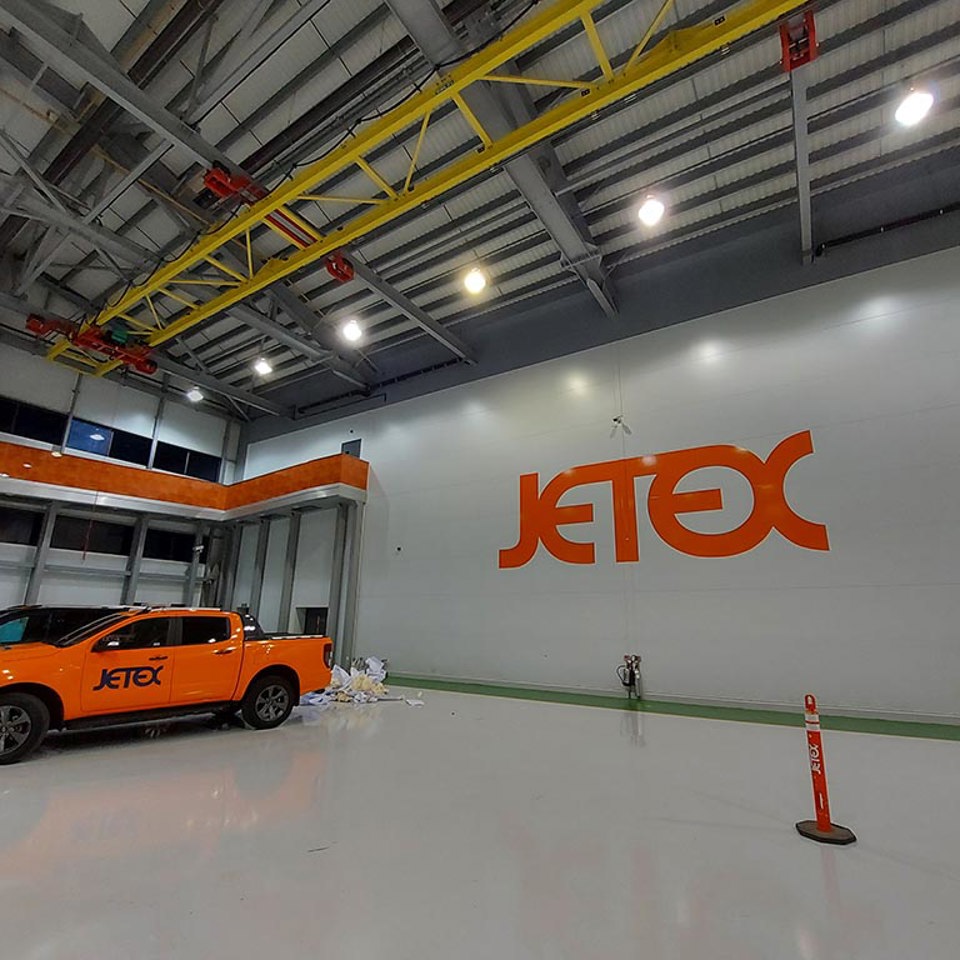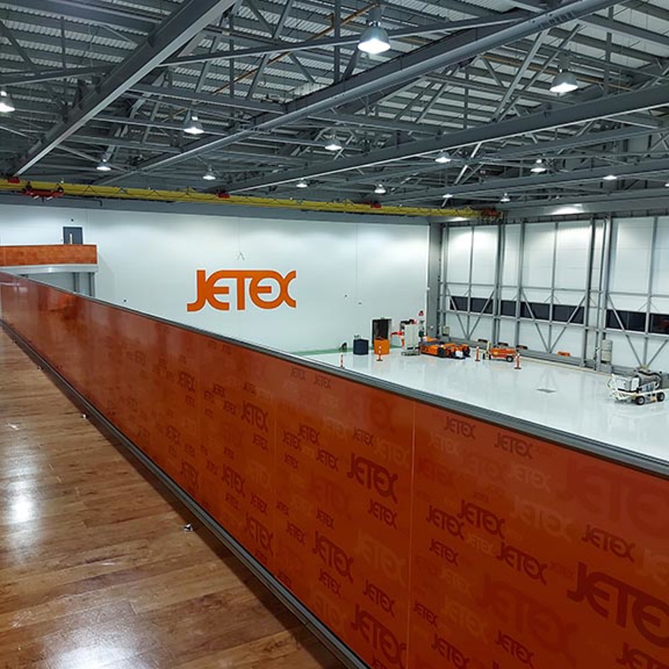 Jetex branding has been added to the internal hangar wall using printed and gloss laminated vinyl 8000mm x 2680mm.