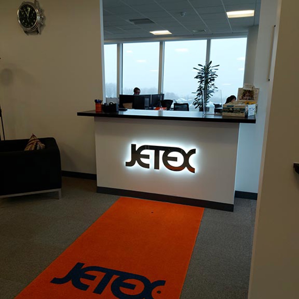 2 wall mounted Jetex logos have been installed to the front of two reception desks. They are machined from 20mm opal acrylic with routed sections containing potted white LEDs and finished with electroplated mirror polished stainless steel to the face.