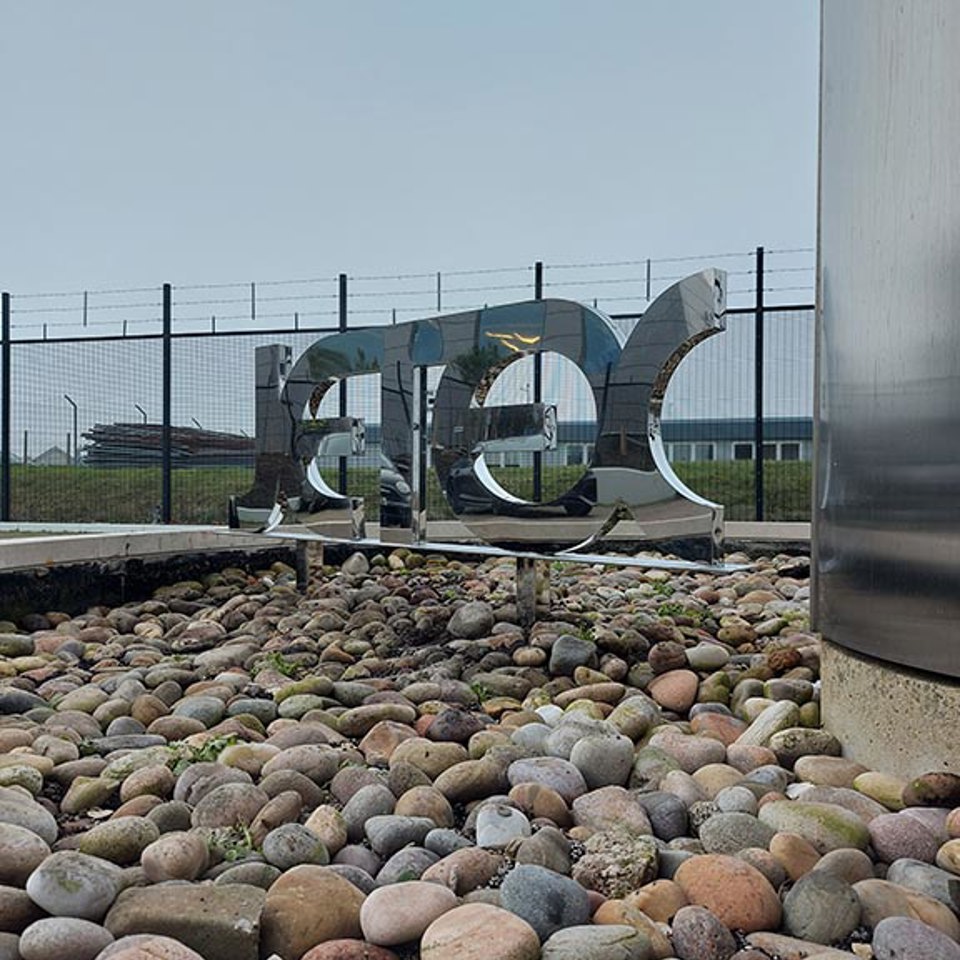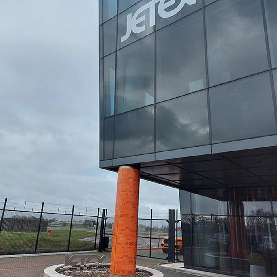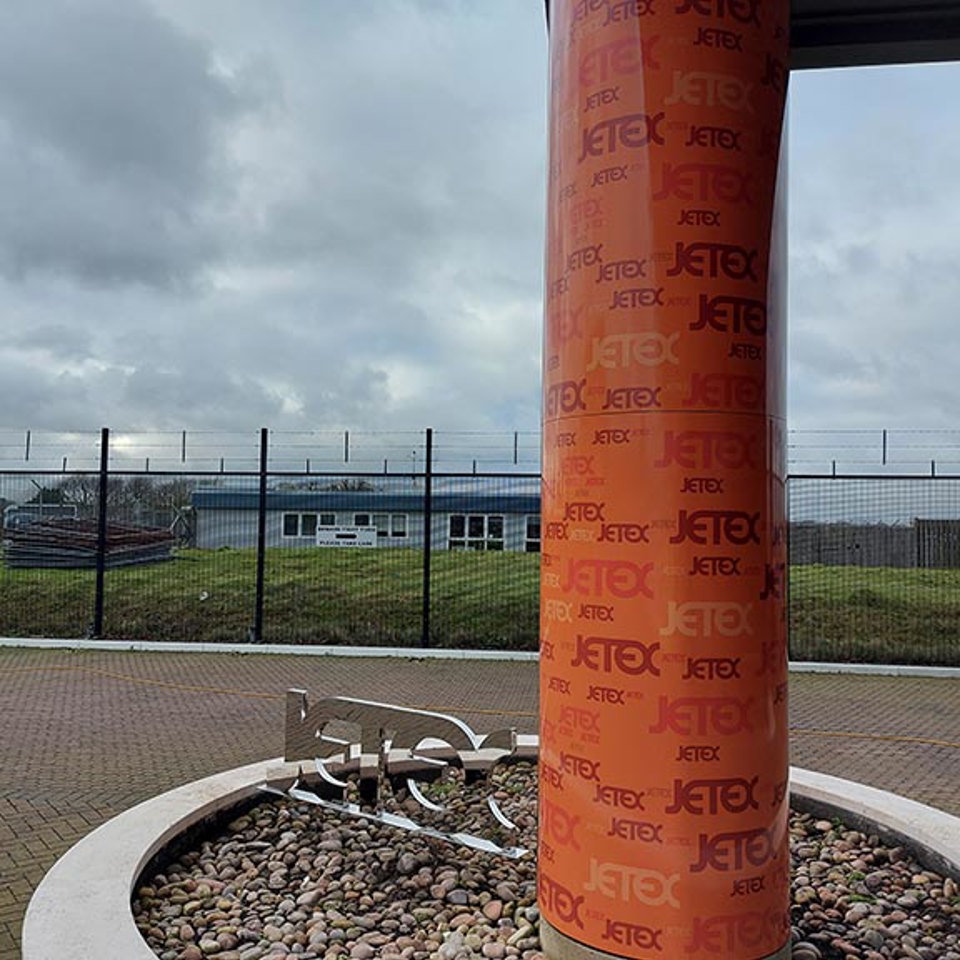 This built-up JETEX logo 1500mm x 500mm x 100mm has been manufactured from polished stainless steel with mirror-polished faces and mounted on polished stainless steel legs mounted in the vehicle roundabout. The logo stands next to a stainless steel column that has been wrapped with printed and gloss laminated vinyl and together, the plinth and the column create a strikingly noticeable centrepiece for guests arriving during the day and night.