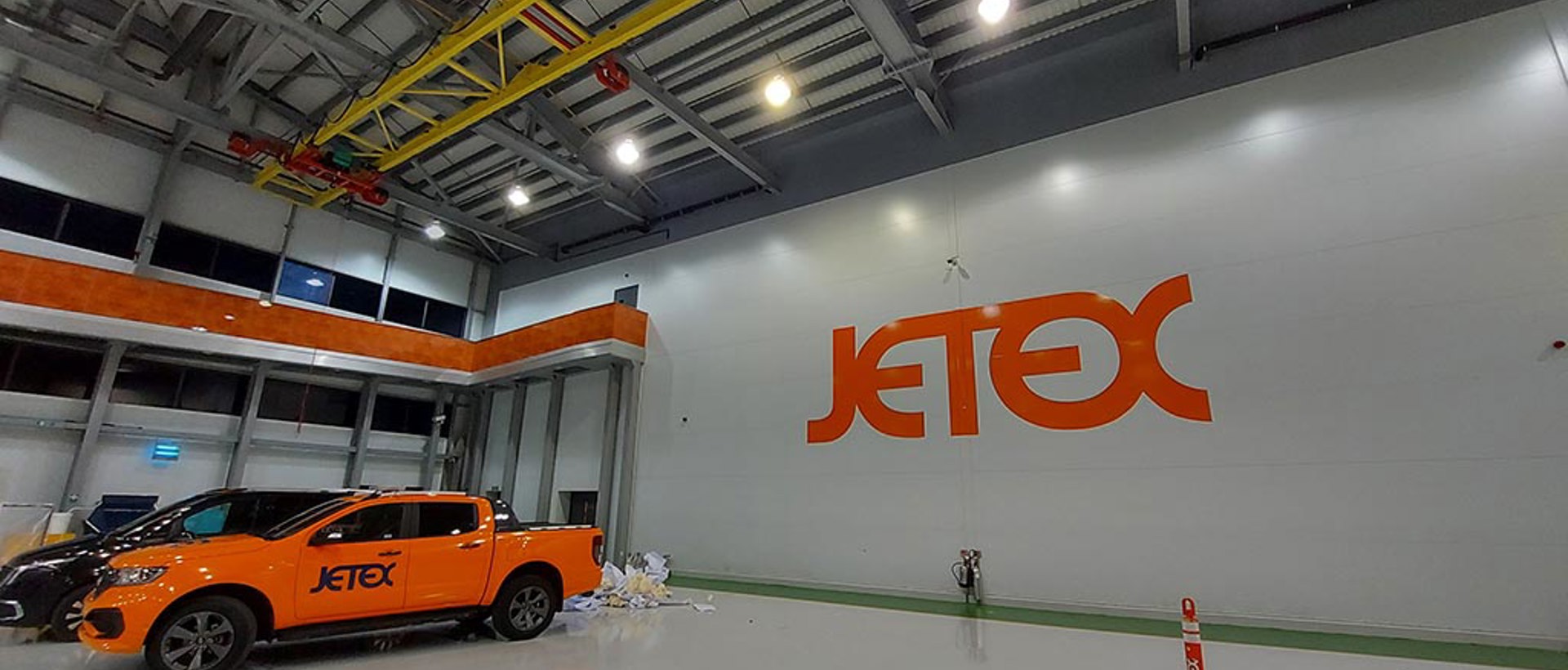 Temporary Jetex branding has been added to the external cladding using printed and gloss laminated vinyl 5950mm x 2000mm. This will be replaced by permanent built up illuminated signage as part of phase 2.