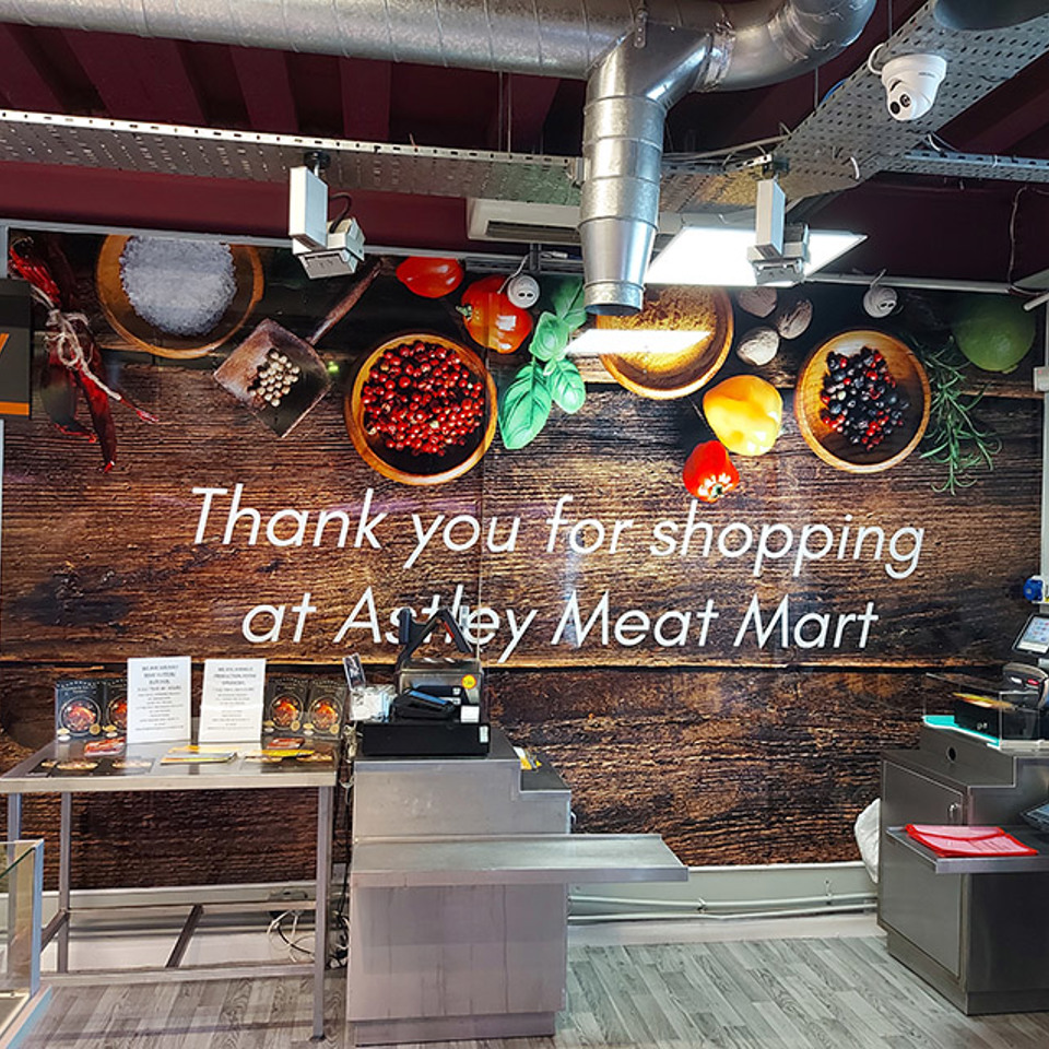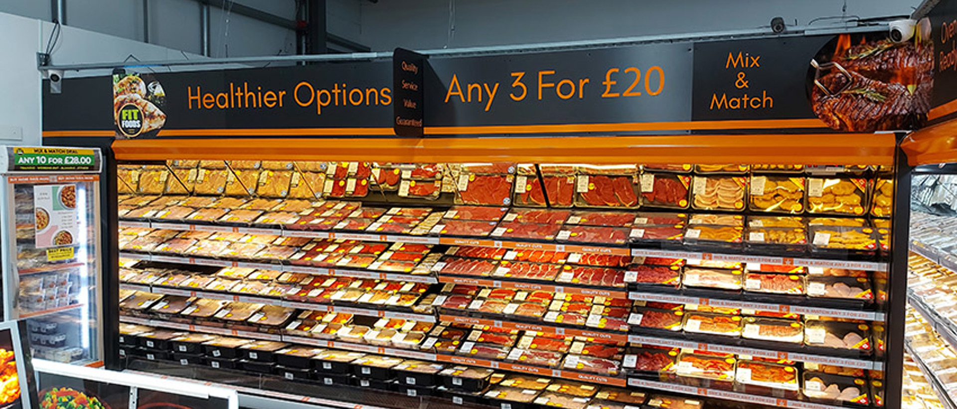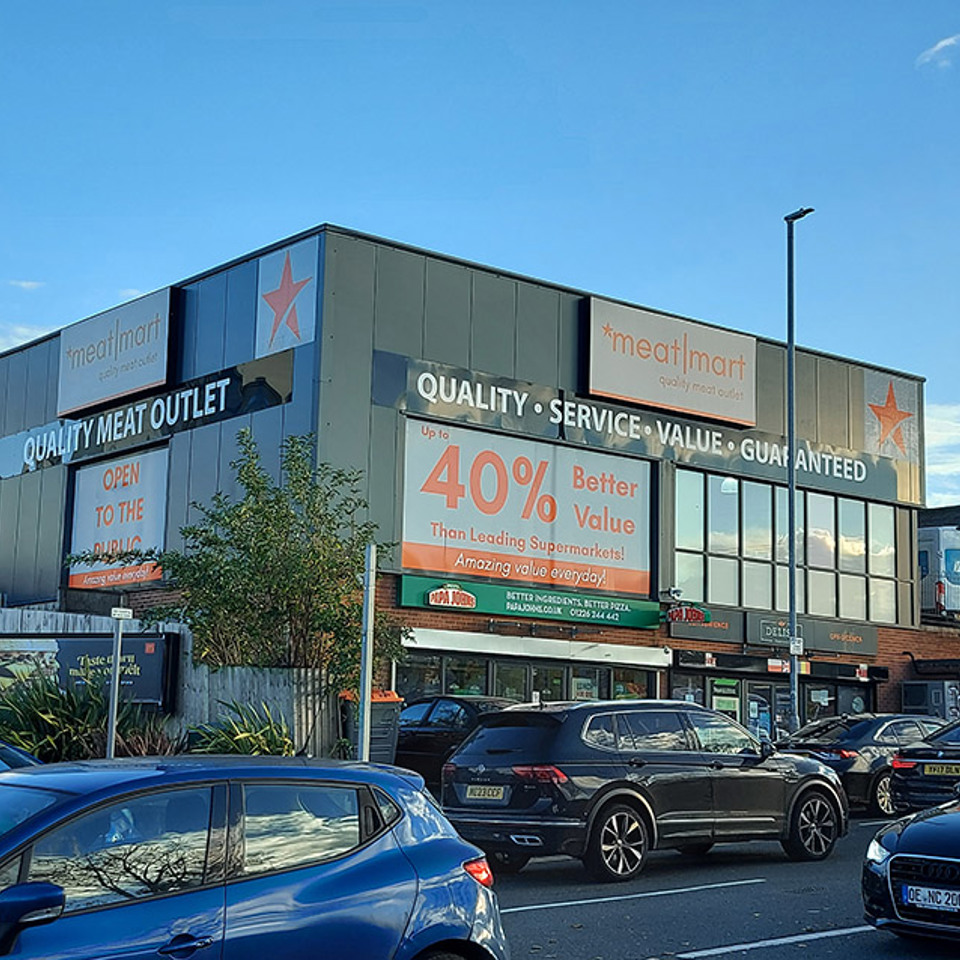 - Outlet Stores: Branded as Meat Mart, the outlet stores maintain design consistency with the high street stores, utilising the same colour theme and visual elements. External signage comprises of illuminated LED flex-face lightboxes, printed ACM panels, and eye-catching window vinyls. Internal signage, including printed header boards, wall vinyls/graphics, and POS materials, aligns with the overarching brand aesthetic, ensuring a seamless brand experience for customers.