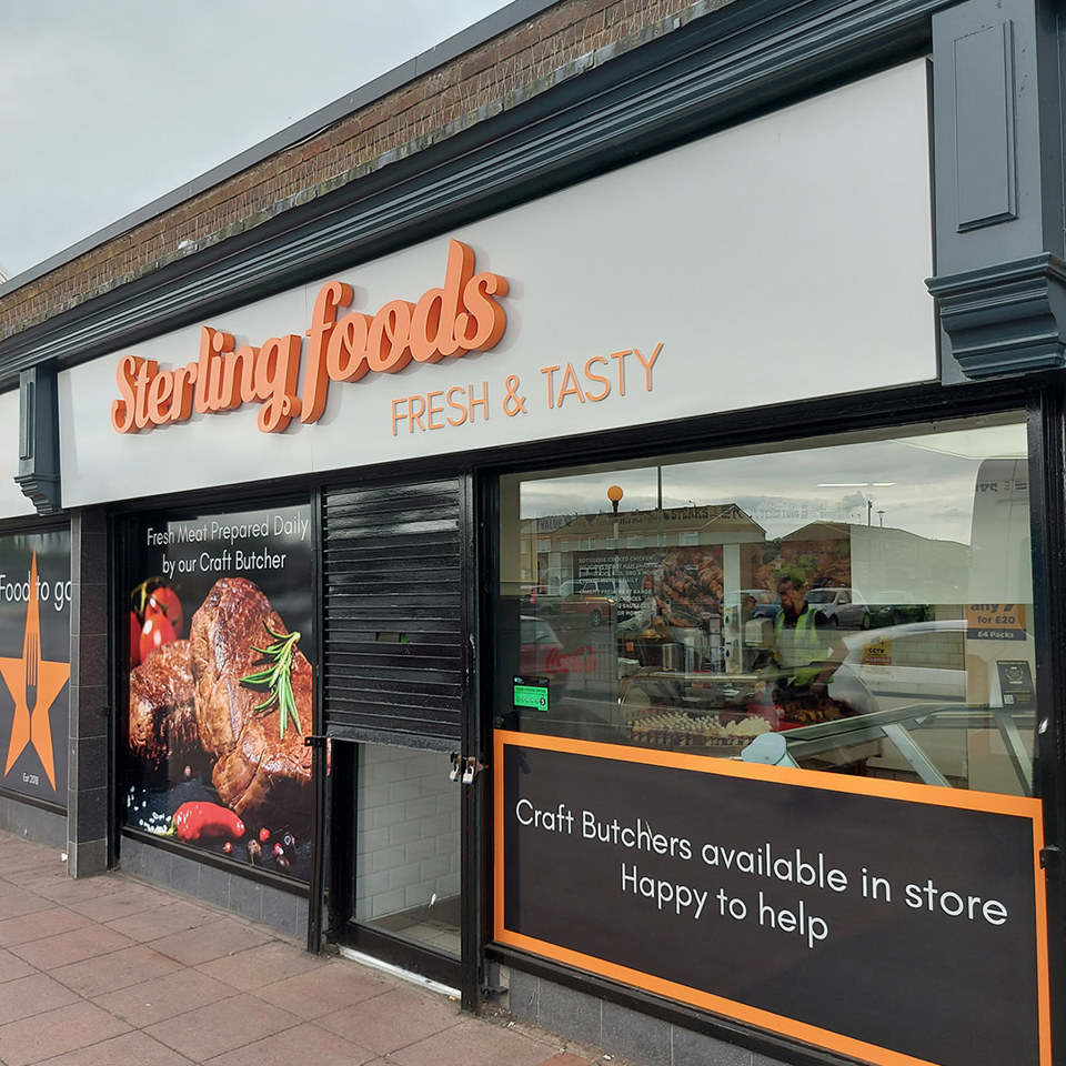 - High Street Stores: The rebranding initiative introduces a fresh look for high street stores, featuring a new single-color Sterling Foods logo with the tagline "Fresh and Tasty." External signage includes powder-coated aluminium trays with built-up 3D letters and LED halo illumination, illuminated circular projecting signs, and vibrant full-colour window graphics. Internally, printed header boards, wall vinyls/graphics, and point-of-sale materials reinforce the brand identity and create a cohesive shopping experience.
