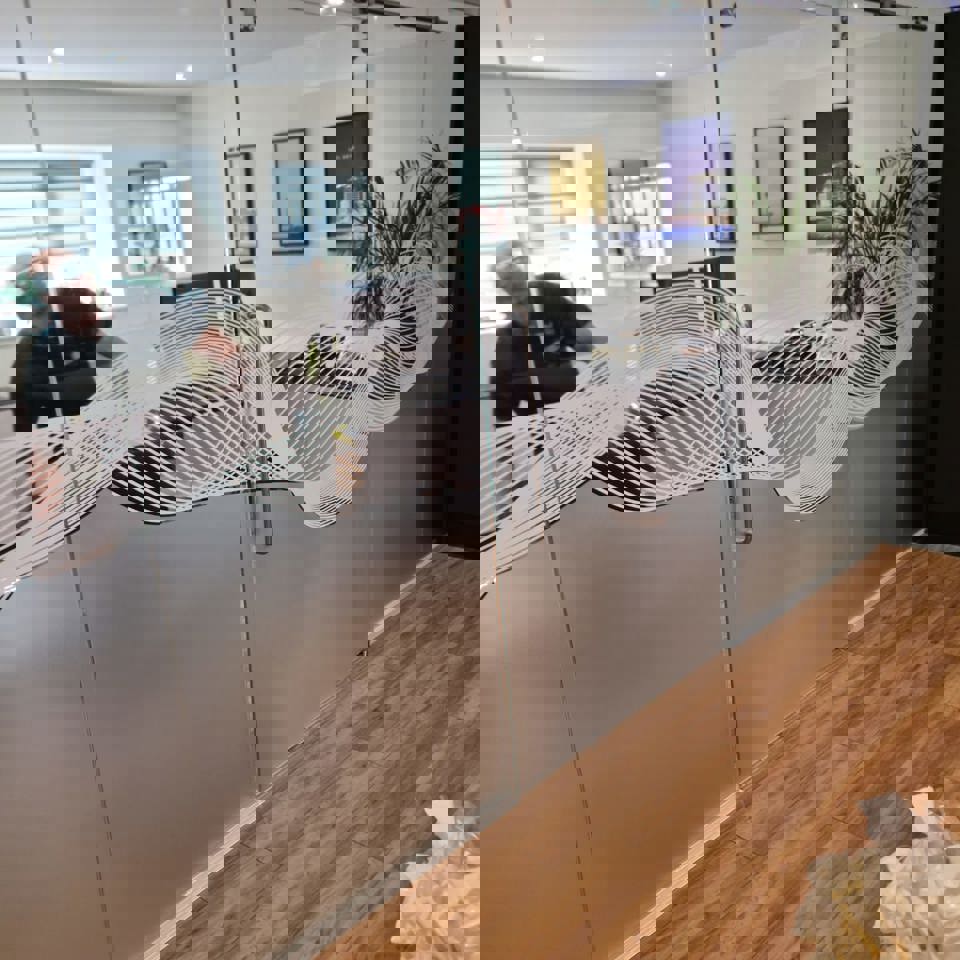 The new glass partition was installed as an extension of an existing glass area, which already carried some decals, so these needed to be removed and replaced with the new design extending across the entire length of the partition.