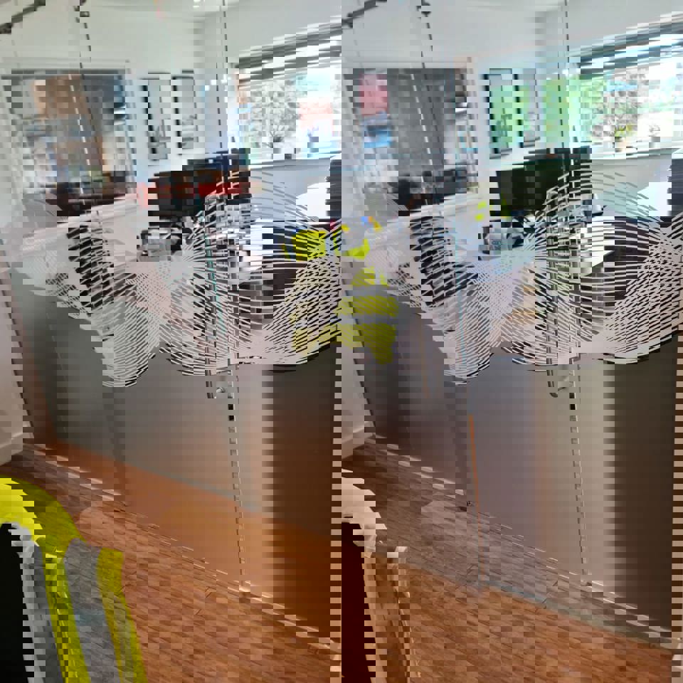 By following the customer brief closely, the first draft of the design was accepted, and the finished result achieves the result Skyline Aero were looking for. The design enhances the space and reinforces the brand, with the line-based design suggesting air flow and wind tunnels providing a fitting aesthetic for the aeronautical company.