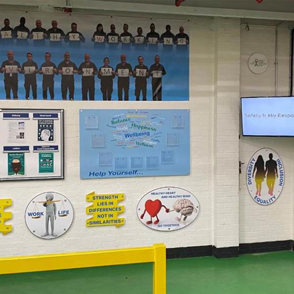 The team at Signs Express were asked to help design and create a dedicated welfare and communications area inside the factory. The space needed to be functional and easy to update but also engaging enough to capture attention. This area would become a hub for notices, achievements, updates, and messages from across the business — a central spot where everyone could stay connected.