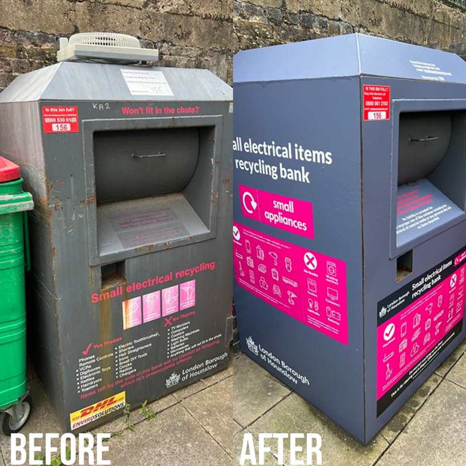SF Print provide signage to Richmond-upon-Thames borough council and local community. They approached Signs Express Twickenham to replace the signage on 15 outside recycling bins that collect Waste Electrical and Electronic Equipment (WEEE). Everyday wear & tear and exposure to all weather meant the graphics had become tired, faded and in need of updating.