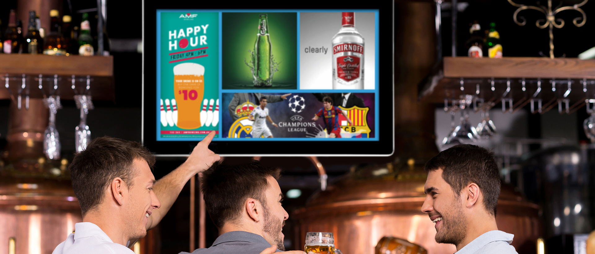 Our wall-mounted displays have a clean, tablet-like look but are built to last, with a mild steel frame and tempered glass front.