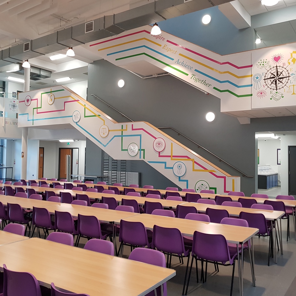 Creating engaging environments within the education sector is essential for both students and visitors. Internal signage offers a valuable and cost-effective way to transform spaces with custom wallpapers, graphics, and floor designs that inspire and motivate. These visual elements can not only reinforce the school's branding and core values but also serve practical functions, such as wayfinding and information display, to help guide individuals through the space. Our expert team can design these solutions from scratch or work with your existing plans to bring your vision to life.